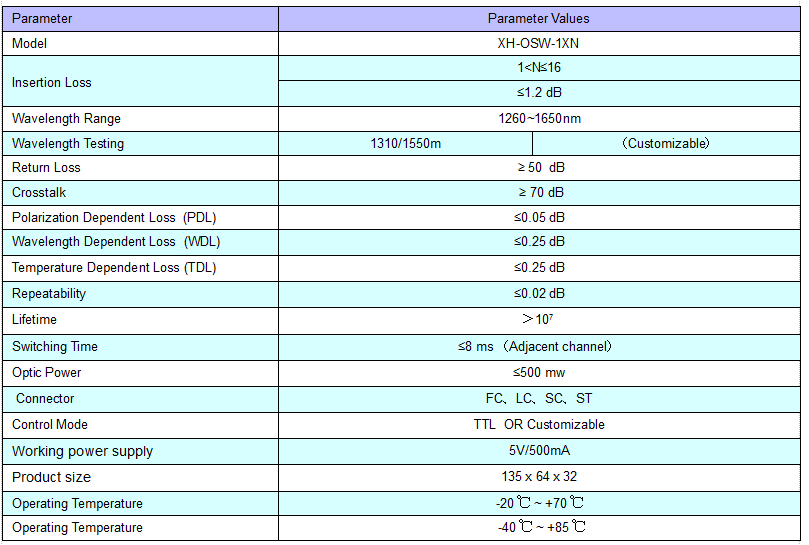 O interruptor ótico mecânico 1xN é um tipo de equipamento de controle de caminho de luz, pode realizar comutação de caminho de luz de fibra ótica multicanal, No sistema de transmissão de fibra ótica, é usado para monitoramento de fibra multicanal, seleção de fonte / detector de luz múltipla e fibra ótica proteção de caminho etc. Além disso, também é usado em sistema de teste de fibra óptica para teste de fibra óptica e seu teste de componente, teste de cabo externo e sistema de monitoramento de sensores ópticos multiponto.